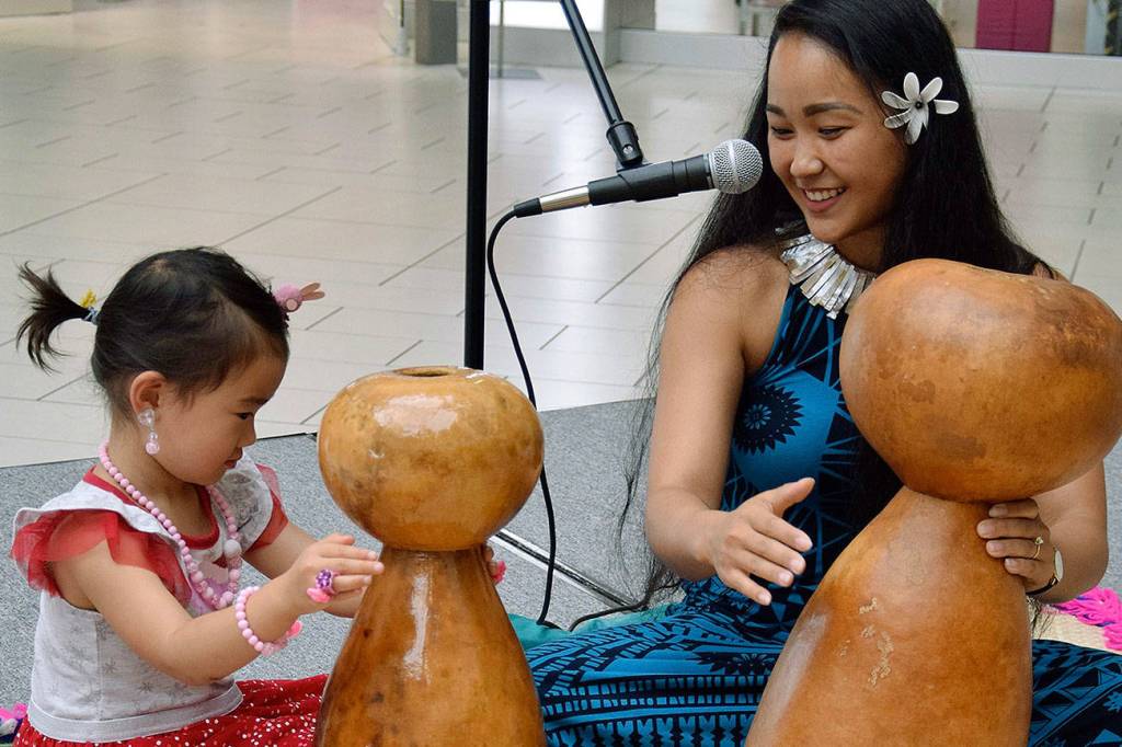 Polynesian Dance Troupe Instructor Kalei’Okalani Matsui shows Edelweiss Ding, 4, how to play the drums during the Rock the Lot: Poly Fest at The Outlet Collection in Auburn last Saturday.