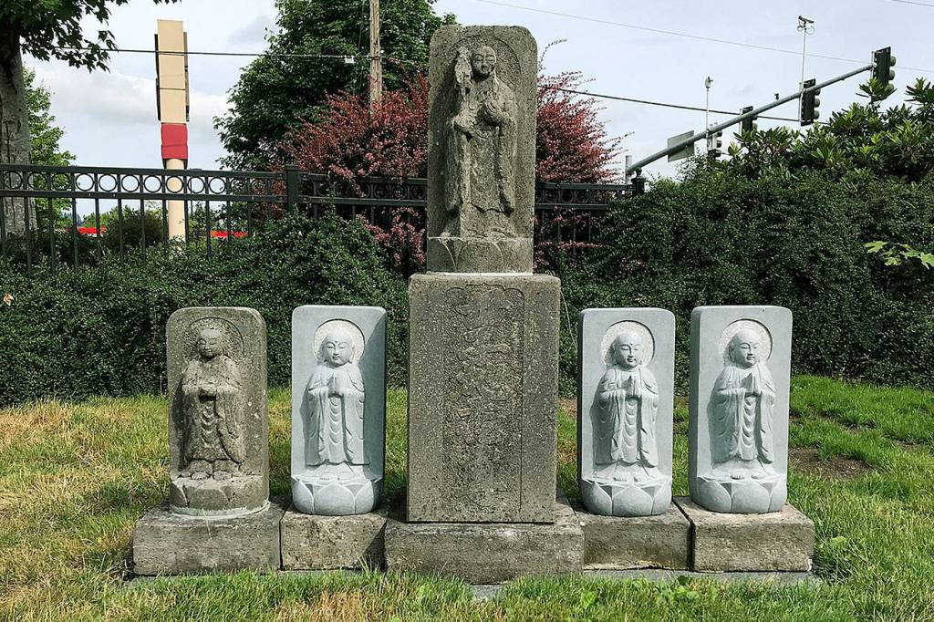 In the late 1930s, a commemorative monument was installed to honor the passing of Tora Kato and her four children whose lives were tragically taken by their father. During the height of anti-Japanese sentiments during World War II, the Jizo statues that were attached to the monument were defaced or stolen. Jizo are Japanese Buddhist figures that are traditionally thought of as guardians who help women and children. One of these statues was returned in the 1980s, leaving three empty spots. In the spring of 2018, three replacement Jizo were imported and installed on the newly stabilized monument.