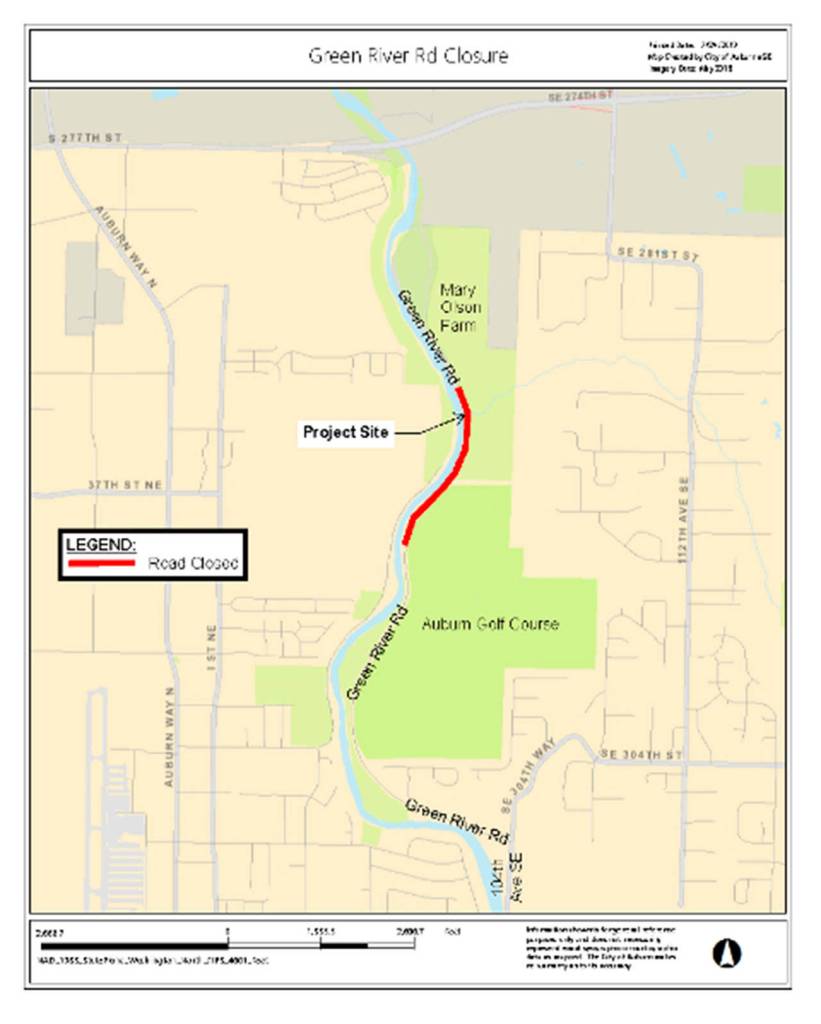 The construction work, by King County Road Services Division for the Green River Road culvert replacement project, will require a full closure of Green River Road to all traffic from just north of the entrance to the Auburn Golf Course to the entrance to Mary Olson Farm.