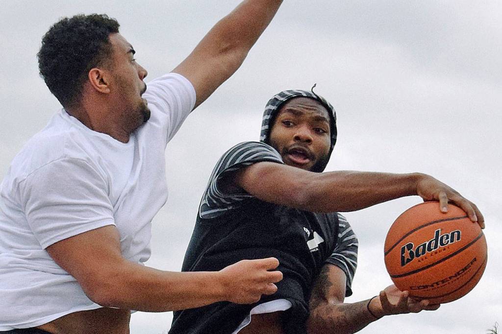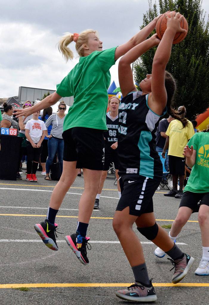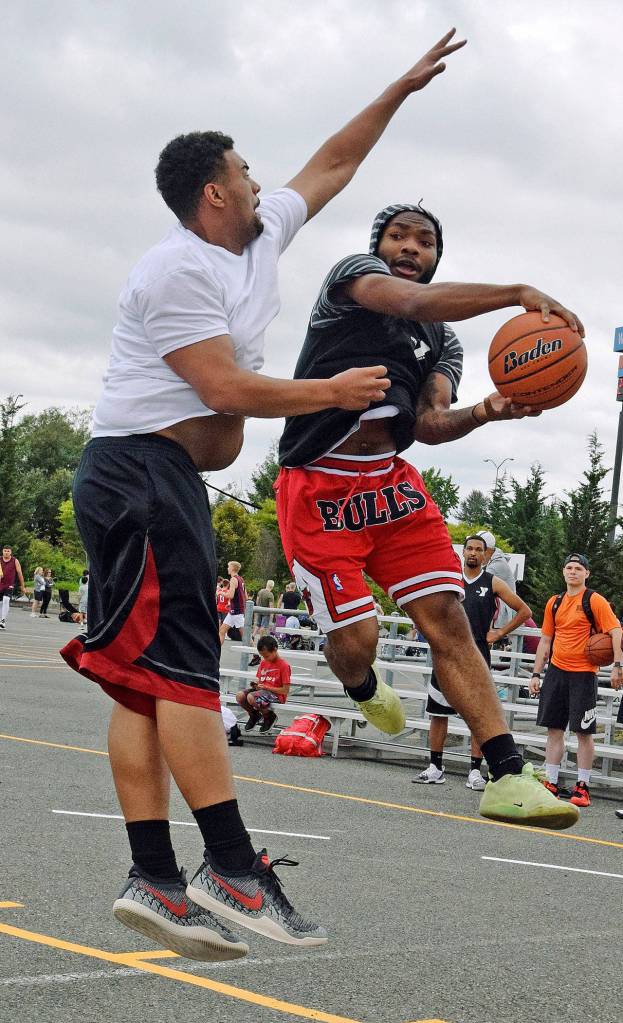 Tavell Cox of the Death Row team, left, tries to block a shot from a driving Raeshon Scales of the Pierce County’s Finest team during the second annual 3 on 3 Slick Watts Classic basketball tournament outside The Outlet Collection | Seattle last Saturday.