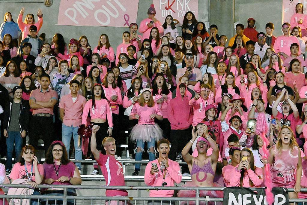 Auburn High School students cheer on their football team during the annual pink out meeting against rival Auburn Mountainview last Friday night at Auburn Memorial Stadium.