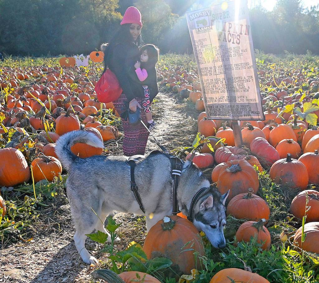 Kiran Ahluwalia and her daughter Kaia, 1, look at pumpkins with their dog, Romeo, at Mosby Farms Pumpkin Patch.