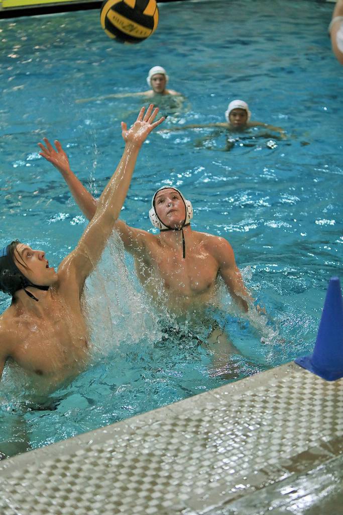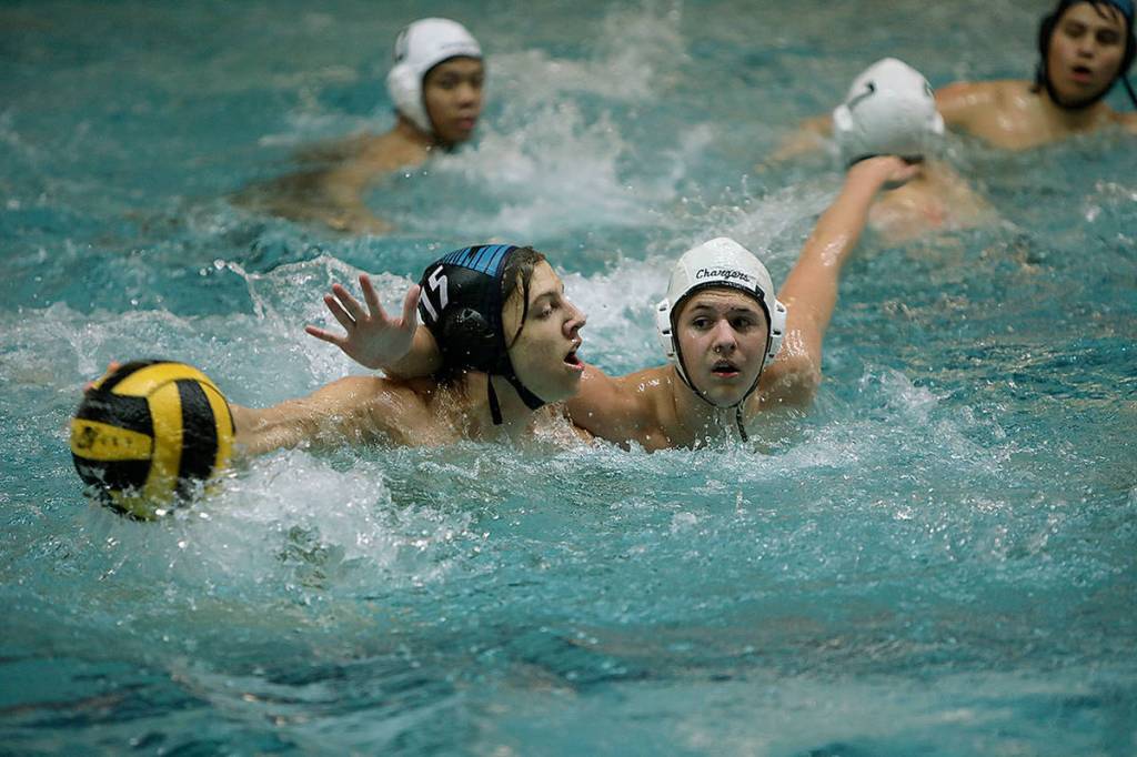 Auburn Riverside’s Robby Walker, left, looks to distribute the ball as Kentridge’s Mac Brennan defending during their Oct. 21 water polo match in Auburn.