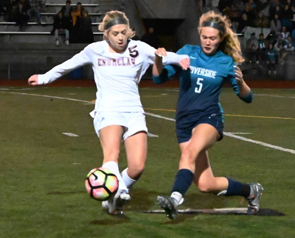 Scoreless in regulation, the teams turned to a five-minute, sudden-death overtime session to settle it. Auburn Riverside immediately put an end to it when Grace Anderson’s left-footed, well-placed diagonal pass skirted between Enumclaw defenders and found a streaking Gutierrez, who beat a defender to the ball and cut to the goal. She stopped, gathered her feet and deposited the ball into the upper right shelf of the net with 3:48 left to play in the extra period.