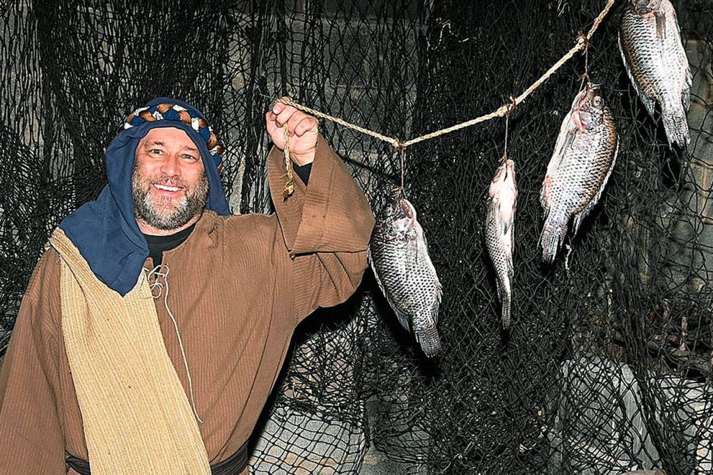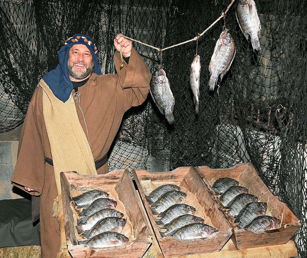 Darin Hubin, above, the “Journey To Bethlehem” fishmonger, shows off his catch of tilapia during the Auburn Adventist Academy’s interactive, outdoor drama production on Dec. 5, the first of four showings over the weekend.