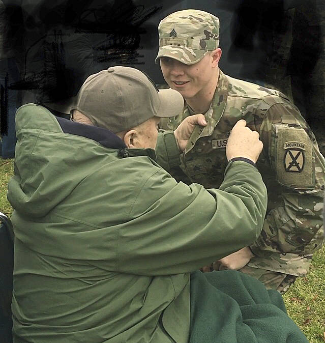 Sgt. Patrick Peterson, an Army combat medic and a recent Fort Benning (Ga.) Airborne graduate, watches while his proud father, Marine Mike Peterson, ANGLICO (Air Naval Gunfire Liaison Company), pins on his wings. Patrick will soon be headed from the 5th Battalion, 25th Field Artillery Regiment at Fort Polk, La., to Germany to join the 173rd Airborne Brigade Combat Team.