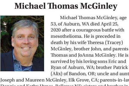 Michael Thomas McGinley, age 53, of Auburn, WA died April 25, 2020 after a courageous battle with mesothelioma. He is preceded in death by his wife Theresa (Tracey) McGinley, brother John, and parents Thomas and JoAnna McGinley. He is survived by his loving sons Eric and Ryan of Auburn, WA; brother Patrick (Alix) of Bandon, OR; uncle and aunt