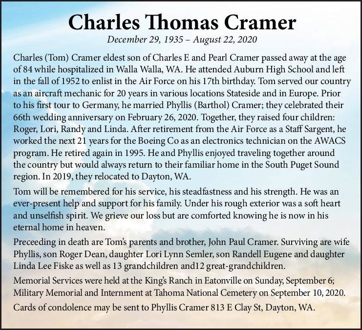 Cards of condolence may be sent to Phyllis Cramer 813 E Clay St, Dayton, WA.