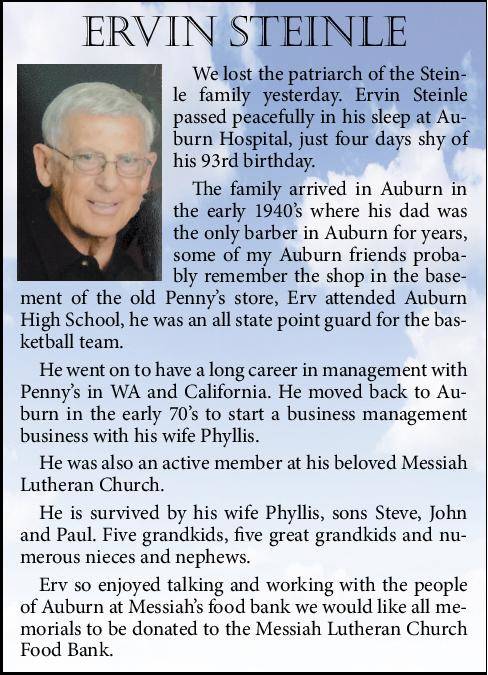 Erv so enjoyed talking and working with the people of Auburn at Messiah’s food bank we would like all memorials to be donated to the Messiah Lutheran Church Food Bank.