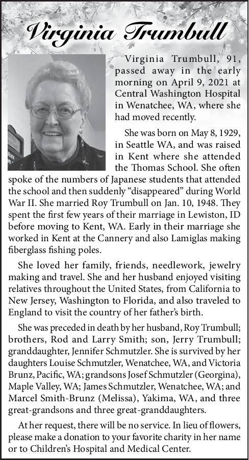 She was preceded in death by her husband, Roy Trumbull; brothers, Rod and Larry Smith; son, Jerry Trumbull; granddaughter, Jennifer Schmutzler. She is survived by her daughters Louise Schmutzler, Wenatchee, WA, and Victoria Brunz, Pacific, WA; grandsons Josef Schmutzler (Georgina), Maple Valley, WA; James Schmutzler, Wenatchee, WA; and Marcel Smith-Brunz (Melissa), Yakima, WA, and three great-grandsons and three great-granddaughters.