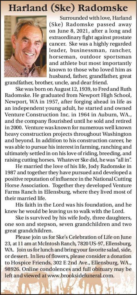 Ske was born on August 12, 1939, to Fred and Ruth Radomske. He graduated from Newport High School, Newport, WA in 1957, after forging ahead in life as an independent young adult, he started and owned Venture Construction Inc. in 1964 in Auburn, WA., and the company flourished until he sold and retired in 2000. Venture was known for numerous well known heavy construction projects throughout Washington and beyond. In addition to his construction career, he was able to pursue his interest in farming, ranching and ultimately settled in on his love of riding, breeding, and raising cutting horses. Whatever Ske did, he was “all in”. He married the love of his life, Jody Radomske in 1987 and together they have pursued and developed a positive reputation of influence in the National Cutting Horse Association. Together they developed Venture Farms Ranch in Ellensburg, where they lived most of their married life.