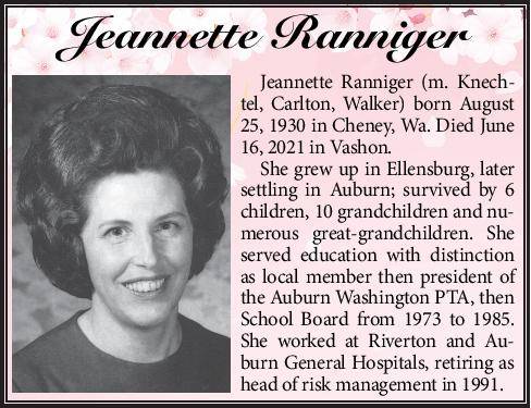 Jeannette Ranniger (m. Knechtel, Carlton, Walker)was born August 25, 1930 in Cheney, Wa. She died June 16, 2021, in Vashon.