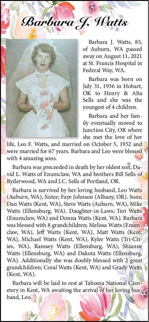 Barbara J. Watts, 85, of Auburn, WA passed away on August 11, 2021 at St. Francis Hospital in Federal Way, WA.