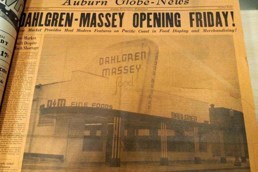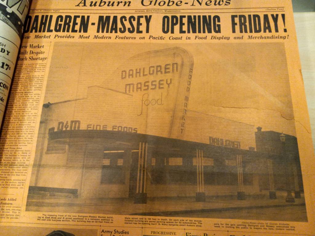 According to Myron Massey’s obituary in the Auburn Reporter on July 28, 2008, before building what at the time was said to be “the largest free-standing supermarket west of the Mississippi River,” he and his business partner, Roy Dahlgren, had operated a smaller market several blocks westward, where, from 1934 to 1946, “they gained a widespread reputation for their mastery of merchandising.”