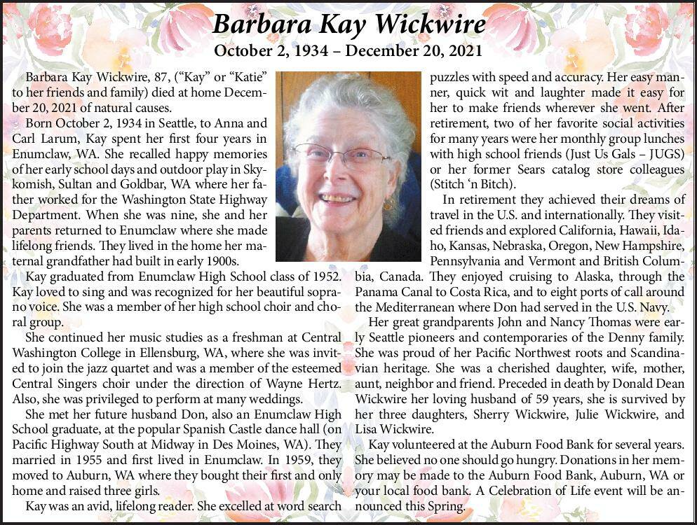 Barbara Kay Wickwire, 87, (“Kay” or “Katie” to her friends and family) died at home December 20, 2021 of natural causes.