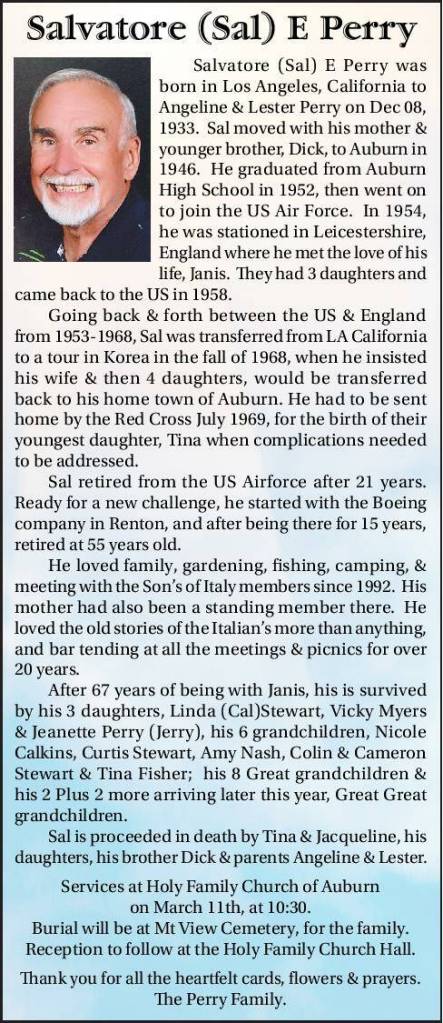 Salvatore (Sal) E Perry was born in Los Angeles, California to Angeline and Lester Perry on Dec 08, 1933. Sal moved with his mother and younger brother, Dick, to Auburn in 1946. He graduated from Auburn High School in 1952, then went on to join the US Air Force. In 1954, he was stationed in Leicestershire, England where he met the love of his life, Janis. They had 3 daughters and came back to the US in 1958.