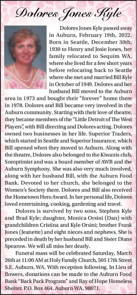 Dolores Jones Kyle passed away in Auburn, February 19th, 2022. Born in Seattle, December 30th, 1930 to Henry and Josie Jones, her family relocated to Sequim WA, where she lived for a few short years before relocating back to Seattle where she met and married Bill Kyle in October of 1949. Dolores and her husband Bill moved to the Auburn area in 1973 and bought their “forever” home there in 1978. Dolores and Bill became very involved in the Auburn community. Starting with their love of theatre, they became members of the “Little Detroit of The West Players”, with Bill directing and Dolores acting. Dolores owned two businesses in her life. Superior Traders, which started in Seattle and Superior Insurance, which Bill opened when they moved to Auburn. Along with the theatre, Dolores also belonged to the Kiwanis club, Soroptimist and was a board member of AWB and the Auburn Symphony. She was also very much involved, along with her husband Bill, with the Auburn Food Bank. Devoted to her church, she belonged to the Women’s Society there. Dolores and Bill also received the Hometown Hero Award. In her personal life, Dolores loved entertaining, cooking, gardening and travel.