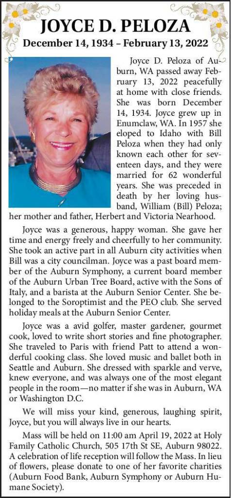 Joyce D. Peloza of Auburn, WA, passed away February 13, 2022 peacefully at home with close friends. She was born December 14, 1934. Joyce grew up in Enumclaw, WA. In 1957, she eloped to Idaho with Bill Peloza when they had only known each other for seventeen days, and they were married for 62 wonderful years. She was preceded in death by her loving husband, William (Bill) Peloza; her mother and father, Herbert and Victoria Nearhood.