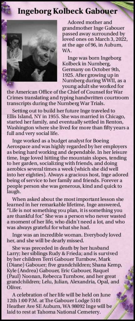 Adored mother and grandmother Inge Gabouer passed away surrounded by loved ones on March 3, 2022, at the age of 96, in Auburn, WA.