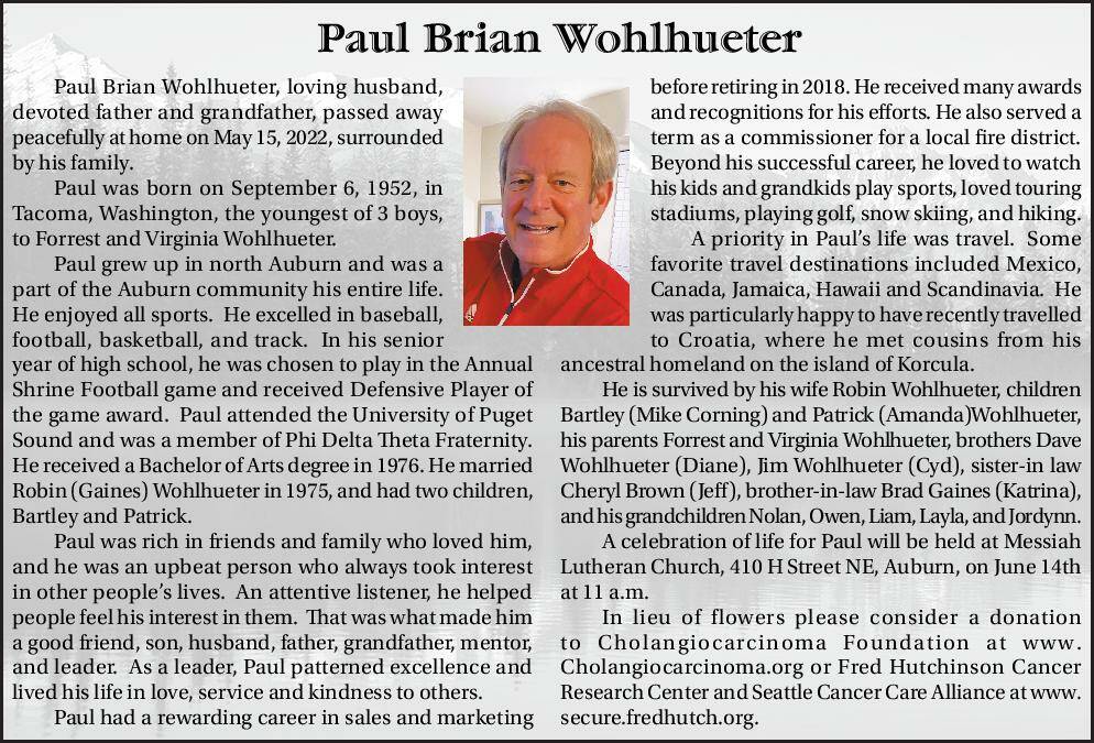 He is survived by his wife Robin Wohlhueter, children Bartley (Mike Corning) and Patrick (Amanda)Wohlhueter, his parents Forrest and Virginia Wohlhueter, brothers Dave Wohlhueter (Diane), Jim Wohlhueter (Cyd), sister-in law Cheryl Brown (Jeff ), brother-in-law Brad Gaines (Katrina), and his grandchildren Nolan, Owen, Liam, Layla, and Jordynn. A celebration of life for Paul will be held at Messiah Lutheran Church, 410 H Street NE, Auburn, on June 14th at 11 a.m.