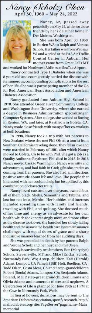 She was born April 30, 1960, in Burien WA to Ralph and Verona Scholz. Her father was from Wausau, WI and worked at the FAA Air Traffic Control Center in Auburn. Her mother came from Great Falls MT and worked for Northwest Airlines at SeaTac Airport. Nancy contracted Type 1 Diabetes when she was 8 years old and courageously battled the disease with its numerous, compounding complications for the rest of her life. She was a participating member of the Go for Red, American Heart Association and American Diabetes Association.