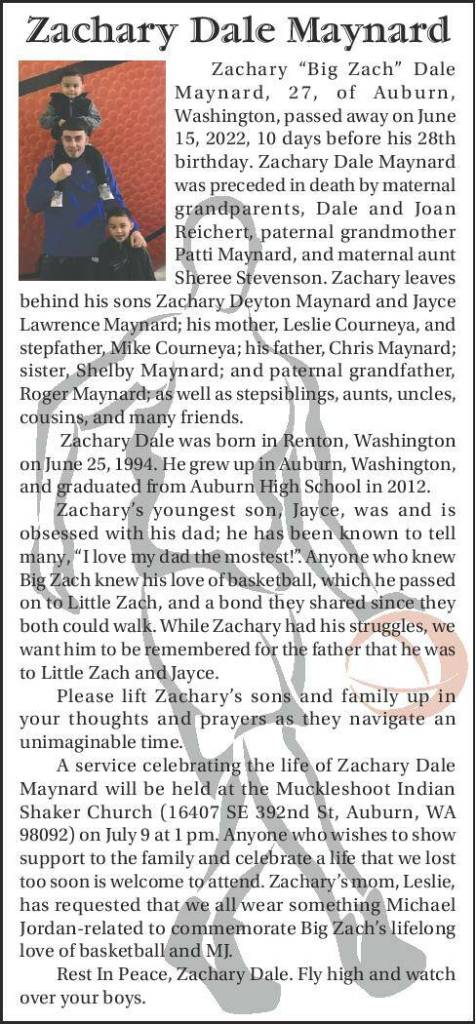 Zachary “Big Zach” Dale Maynard, 27, of Auburn, Washington, passed away on June 15, 2022, 10 days before his 28th birthday. Zachary Dale Maynard was preceded in death by maternal grandparents, Dale and Joan Reichert, paternal grandmother Patti Maynard, and maternal aunt Sheree Stevenson. Zachary leaves behind his sons Zachary Deyton Maynard and Jayce Lawrence Maynard; his mother, Leslie Courneya, and stepfather, Mike Courneya; his father, Chris Maynard; sister, Shelby Maynard; and paternal grandfather, Roger Maynard; as well as stepsiblings, aunts, uncles, cousins, and many friends.