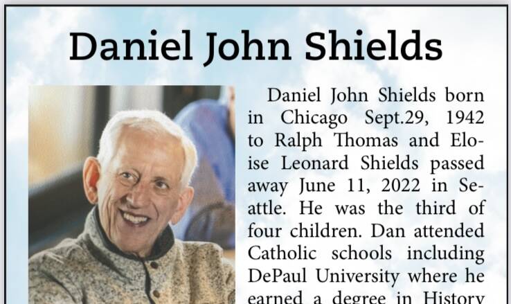 Daniel John Shields born in Chicago Sept.29, 1942 to Ralph Thomas and Eloise Leonard Shields passed away June 11, 2022 in Seattle. He was the third of four children. Dan attended Catholic schools including DePaul University where he earned a degree in History with a minor in Philosophy.