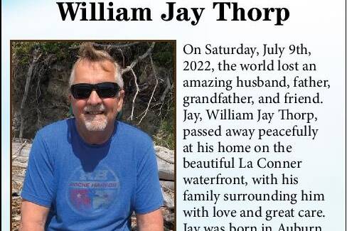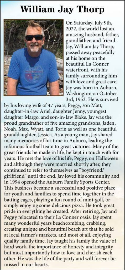 On Saturday, July 9th, 2022, the world lost an amazing husband, father, grandfather, and friend. Jay, William Jay Thorp, passed away peacefully at his home on the beautiful La Conner waterfront, with his family surrounding him with love and great care. Jay was born in Auburn, Washington on October 3rd, 1953. He is survived by his loving wife of 47 years, Peggy, son Matt, daughter-in-law Ariel, daughter Jenny, youngest daughter Margo, and son-in-law Blake. Jay was the proud grandfather of five amazing grandsons, Jaden, Noah, Max, Wyatt, and Torin as well as one beautiful granddaughter, Jessica. As a young man, Jay shared many memories of his time in Auburn, leading the infamous football team to great victories. Many of the great friends he made in life, he kept in touch with for years. He met the love of his life, Peggy, on Halloween and although they were married shortly after, they continued to refer to themselves as “boyfriend/ girlfriend” until the end. Jay loved his community and in 1994 opened the Auburn Family Sports Center. This business became a successful and positive place for youth and families to spend time together in the batting cages, playing a fun round of mini-golf, or simply enjoying some delicious pizza. He took great pride in everything he created. After retiring, Jay and Peggy relocated to their La Conner oasis. Jay spent many wonderful years beachcombing, crabbing, creating unique and beautiful beach art that he sold at local farmer’s markets, and most of all, enjoying quality family time. Jay taught his family the value of hard work, the importance of honesty and integrity but most importantly how to love and cherish each other. He was the life of the party and will forever be missed in our hearts.