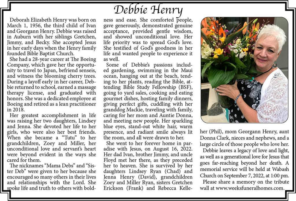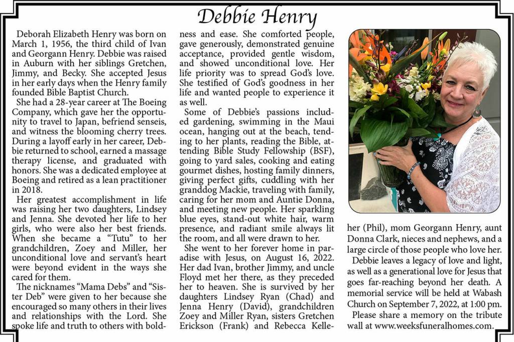 Debbie Henry died Aug. 16, 2022 at the age of 66.