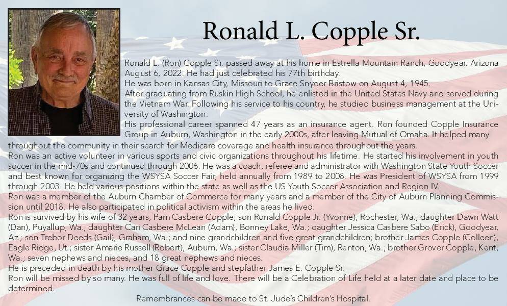 Ron is survived by his wife of 32 years, Pam Casbere Copple; son Ronald Copple Jr. (Yvonne), Rochester, Wa.; daughter Dawn Watt (Dan), Puyallup, Wa.; daughter Cari Casbere McLean (Adam), Bonney Lake, Wa.; daughter Jessica Casbere Sabo (Erick), Goodyear, Az.; son Trebor Deeds (Gail), Graham, Wa.; and nine grandchildren and five great grandchildren; brother James Copple (Colleen), Eagle Ridge, Ut.; sister Amarie Russell (Robert), Auburn, Wa.; sister Claudia Miller (Tim), Renton, Wa.; brother Grover Copple, Kent, Wa.; seven nephews and nieces, and 18 great nephews and nieces.