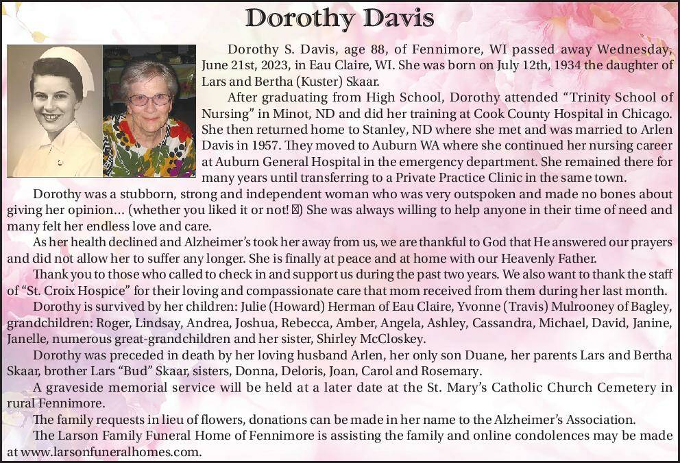 Dorothy S. Davis, age 88, of Fennimore, WI passed away Wednesday, June 21st, 2023, in Eau Claire, WI. She was born on July 12th, 1934 the daughter of Lars and Bertha (Kuster) Skaar.