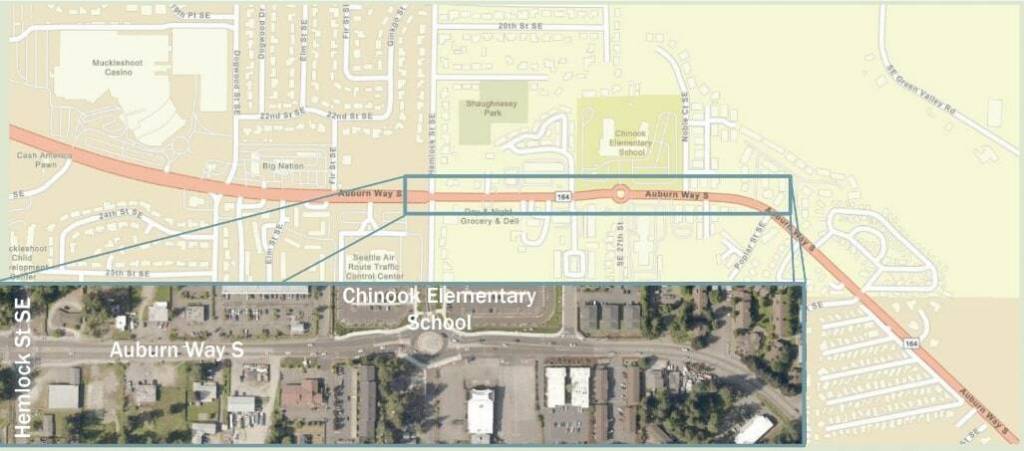 Auburn Way South between Hemlock Street Southeast on the west and Poplar Street to the east is a critical corridor — providing access to Auburn, Enumclaw, the Muckleshoot Reservation and Casino, its new hotel and conference center, Chinook Elementary School, the Auburn Transit Center, surrounding communities and numerous recreational amenities.