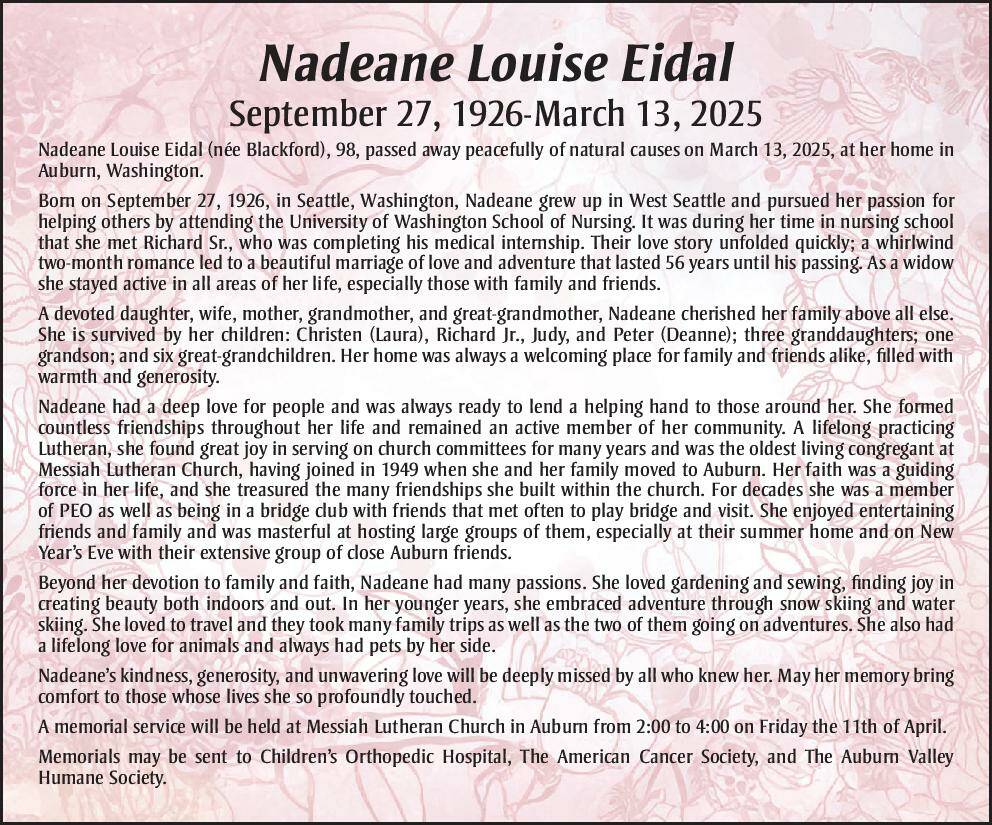 Nadeane Louise Eidal (née Blackford), 98, passed away peacefully of natural causes on March 13, 2025, at her home in Auburn, Washington.