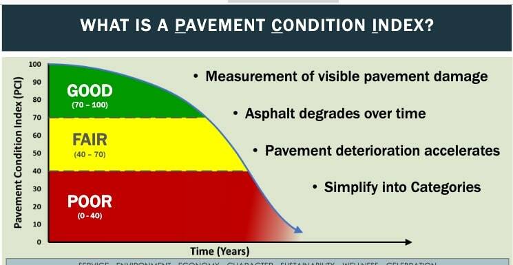 To rate the condition, the city uses a Pavement Condition Index (PCI), which is based on the amount of deterioration visible on the pavement surface. On a total scale of 0-100, a PCI of 100-70, the good range, starts with a brand new asphalt road or street, while 70-40 represents the fair range when the city begins to look at maintenance activities. A rating of 40-zero is the poor range with zero, in effect, equal to a gravel road.