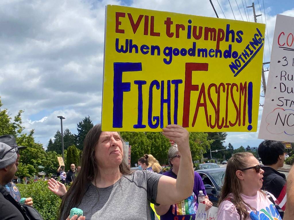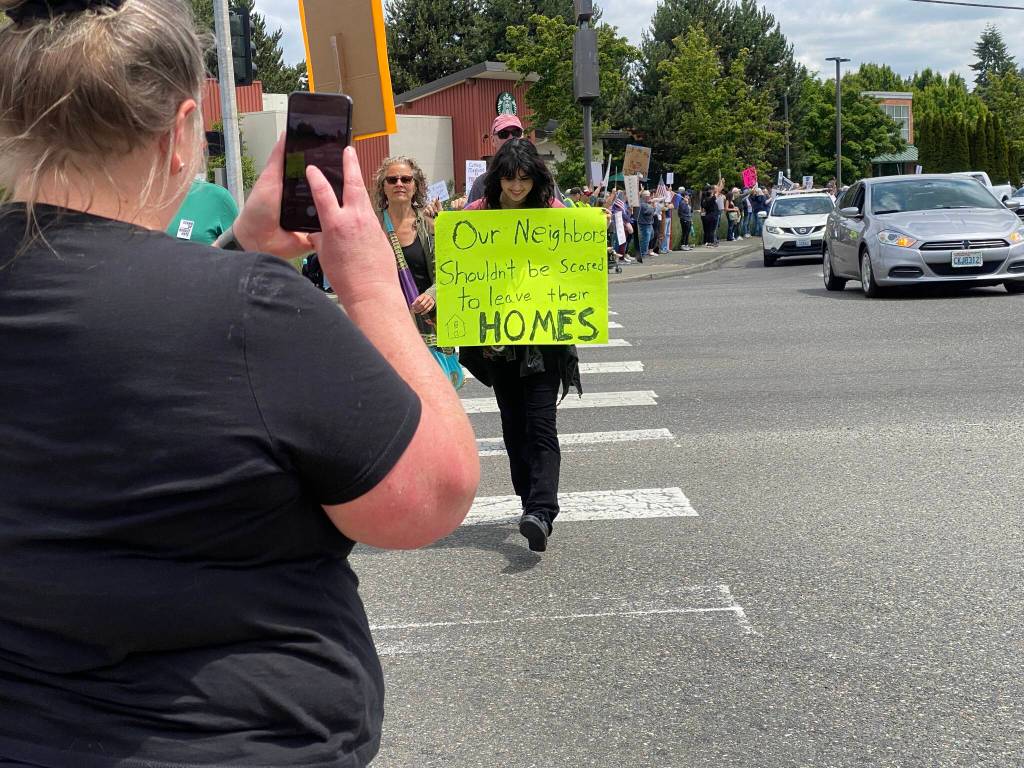 Nearly 1,000 people filled the sidewalks of 15th Street NE and Harvey Road near Auburn Way as part of the nationwide “No Kings” protests held June 14. The “No Kings” movement is a response to the perceived authoritarian tendencies of the Trump administration, according to organizers.