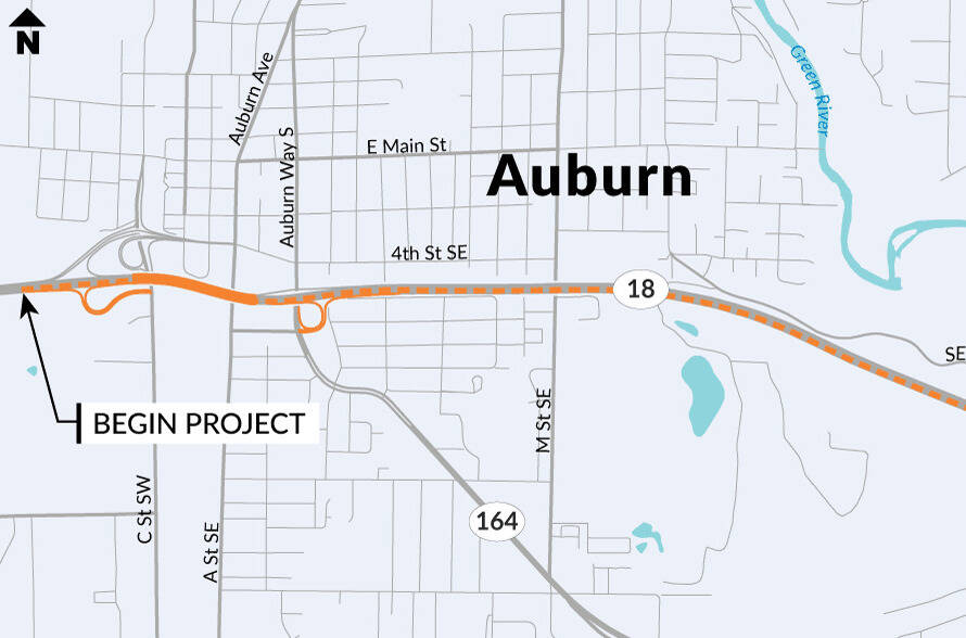 All eastbound SR 18 vehicles will need to use the off-ramp to C Street Southwest and may follow a signed detour using city streets to the Auburn Way South on-ramp to eastbound SR 18. Police officers will help direct traffic through intersections along the detour.
