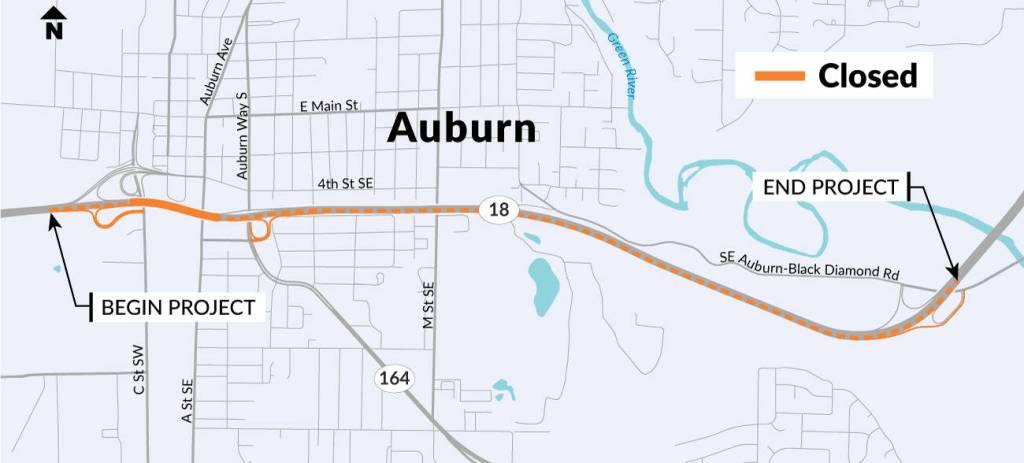 From 2 a.m. Sunday, Sept. 21, to 5 a.m. Monday, Sept. 22, westbound SR 18 will close at Auburn Way South/SR 164.