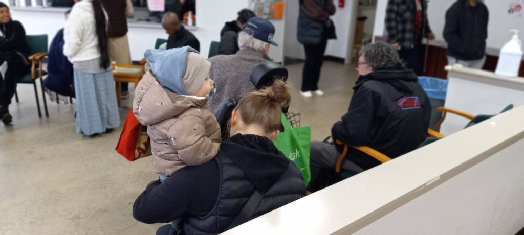 Once out of the cold, clients made their way to the lobby to pass their time — mothers cooing to their babies, men and woman studying cellphones, quietly talking, and in one woman’s case, nursing a bloody knee.