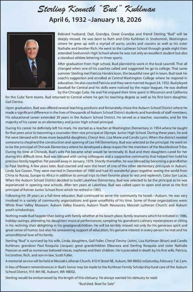 In lieu of flowers remembrances in Bud’s honor may be made to the Kuhlman Family Scholarship fund care of the Auburn School District, 915 4th NE, Auburn, WA 98002.