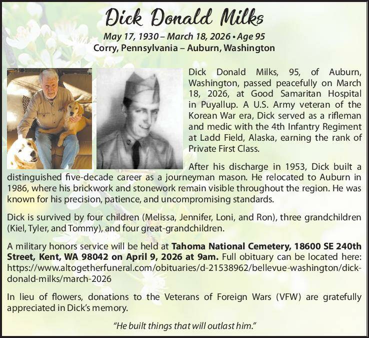 Dick Donald Milks, 95, of Auburn, Washington, passed peacefully on March 18, 2026, at Good Samaritan Hospital in Puyallup. A U.S. Army veteran of the Korean War era, Dick served as a rifleman and medic with the 4th Infantry Regiment at Ladd Field, Alaska, earning the rank of Private First Class.