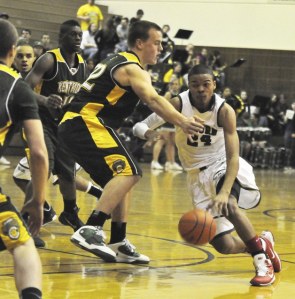 Auburn's Kevin Henderson drives on Kentridge's Caleb Smith during SPSL action Tuesday. Henderson scored 26 points in the Trojans' win.