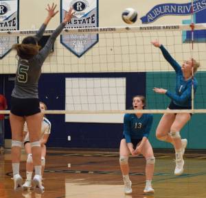 Auburn Riverside’s Lilli Zimmerman spikes the ball as Kentridge’s Austin Ibale tries for a block during a North…