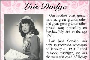 Lois Jane Carlson died July 3, 2022 at the age of 91.