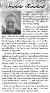Virginia Trumbull, 91, passed away in the early morning on April 9, 2021 at Central Washington Hospital in…