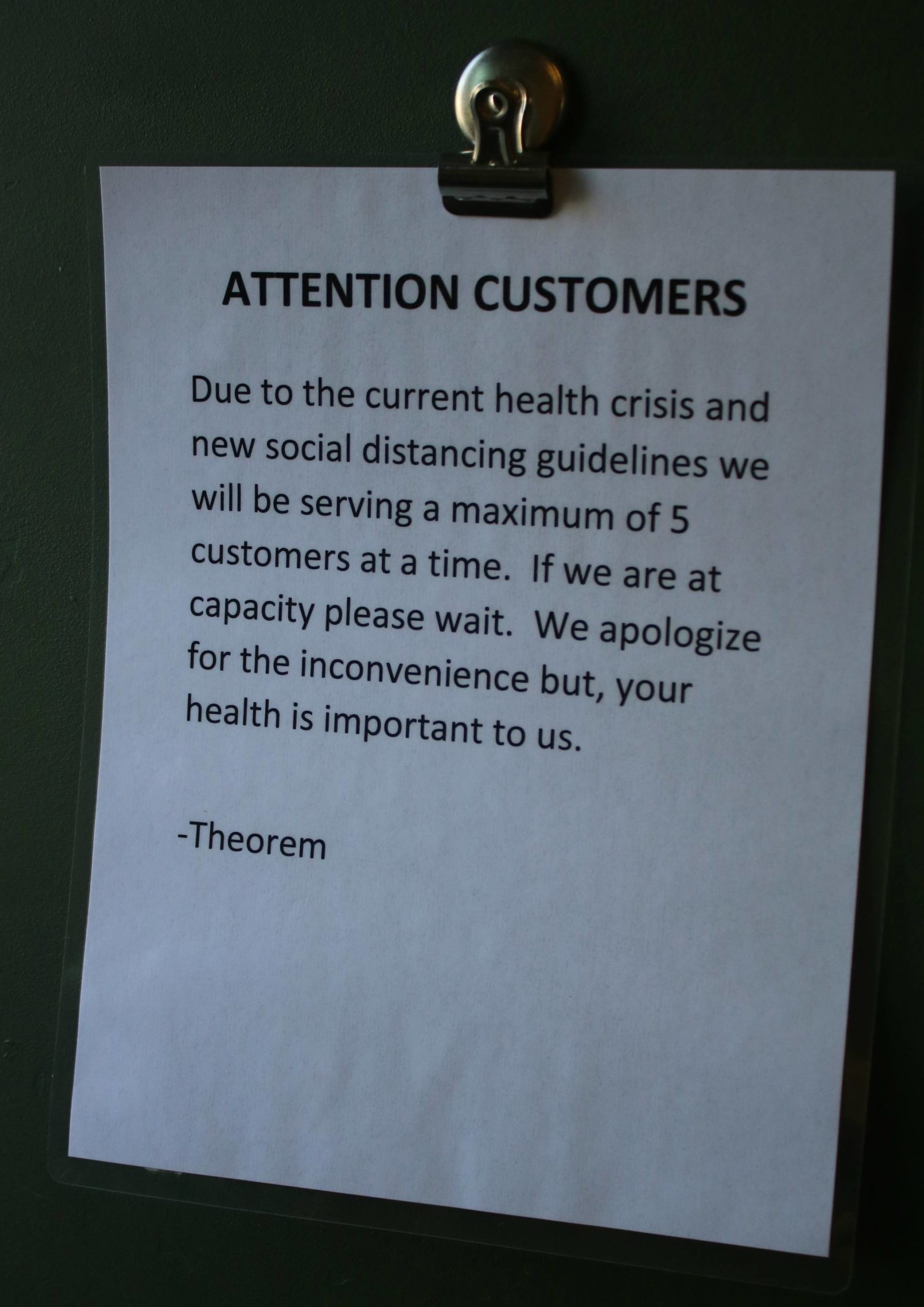 Theorem is limiting its occupancy to five customers at a time and once someone uses the ATM, an employee will immediately spray it with disinfectant and wipe it down. Wilson said that some employees are taking precautions by quarantining themselves at home and they’ll return to work when they’re ready.