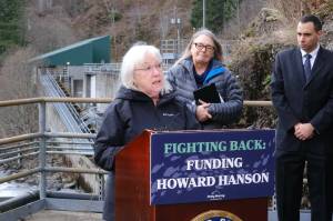 Sen. Patty Murray adresses a crowd of dignitaries at Howard Hanson Dam about the $190 million she has secured for an important fish passage project and to protect against flooding at the dam. Courtesy photo