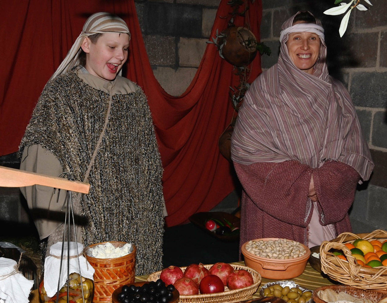 Darin Hubin, above, the “Journey To Bethlehem” fishmonger, shows off his catch of tilapia during the Auburn Adventist Academy’s interactive, outdoor drama production on Dec. 5, the first of four showings over the weekend.