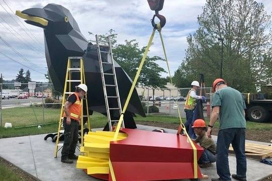 Standing 12 feet tall and stretching 18 feet long, the crow is a public art piece, a powder-coated aluminum structure shaped by the hands of artist Peter Reiquam.