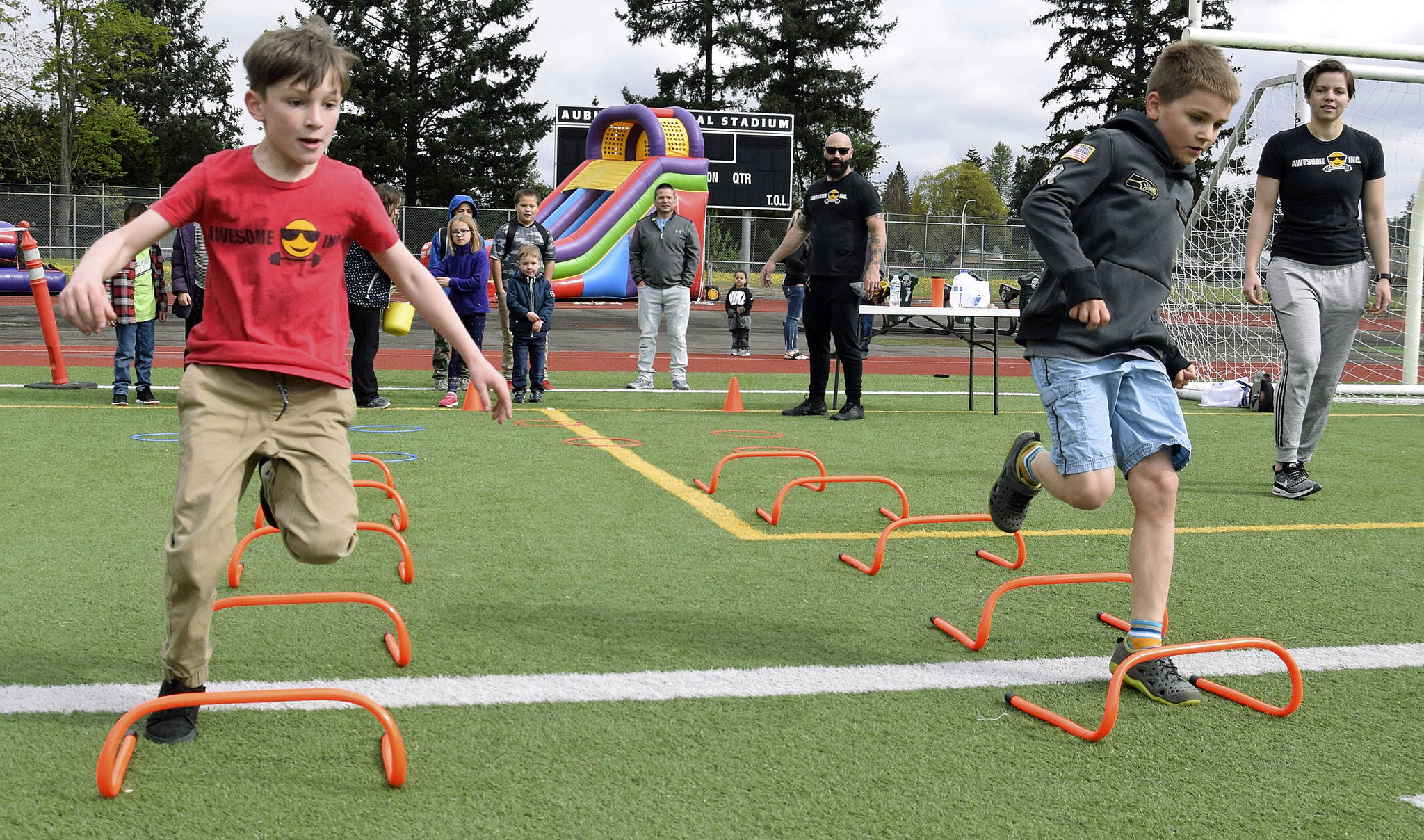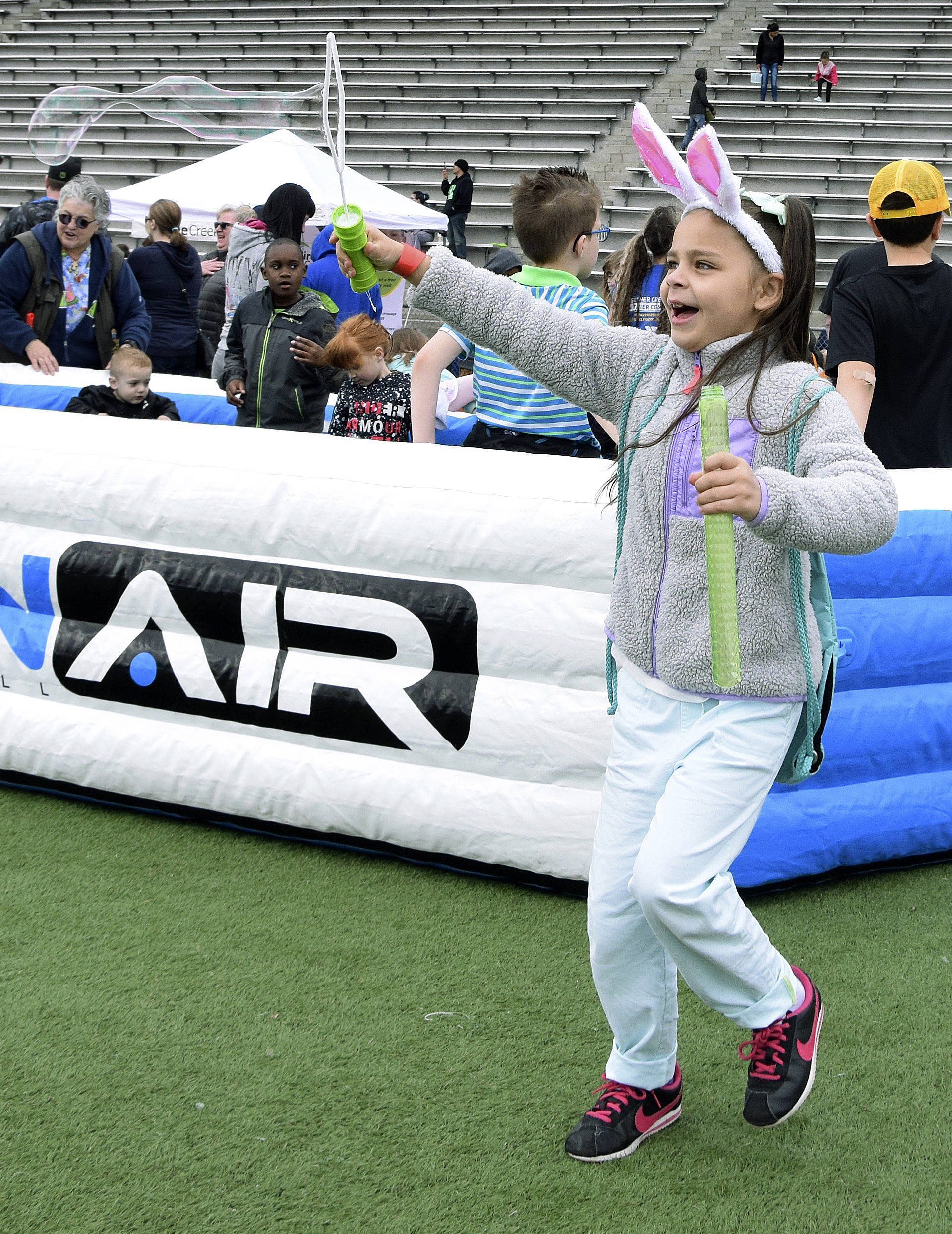 A helicopter swooped in at Auburn Memorial Field on Saturday, dumping thousands of Easter eggs onto the synthetic turf field – just in time for children to scramble and collect them in baskets and buckets.
