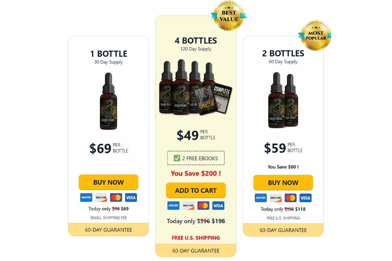 The creators of Jungle Beast Pro offer their customers a 60-day money-back guarantee on their purchases. Customers are asked to return the remaining bottles for a full refund and can contact the company at: